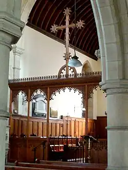 The bellcote contains two bells. The larger one, original to the church and measuring 20 inches (51 cm), was founded in 1879 by Mears and Stainbank. It is hung for use with a bellrope, being in its original position within the bellcote, with a full metal wheel. The smaller one is connected to the clock, which as of 2016 was awaiting repair. This bell measures 14 inches (36 cm) and was founded by John Taylor of Loughborough, possibly in the 1930s when the turret clock mechanism was installed. It has been added at a lower level on the east side of the bellcote, and is struck by a clock hammer. Both bells are inscribed with the maker's name, and the larger one has the date 1879.[14] The clock bell, clock face and turret mechanism by Potts of Leeds was donated by the daughters of George Lewis, who died aged 91 in 1932, having served as churchwarden for 41 years.[15]