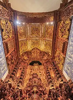 The tops of the nave are truncated by two side altars with rounded arches, surmounted by two frames in low relief hiding spaces for shrines, and two tribunes protected by a lattice (coated with a profuse amount of decoration carved in acanthus). Over the rounded, triumphal arch is a medallion with a representation of the Virgin. The chancel, which is deep and quite high, is covered by a false barrel vault with six carved coffers, forming a rosetta, while the side walls are covered by woodwork and azulejos depicting two scenes: the "Transportation of the bunch of grapes from the Promised Land" (Gospel) and "fall of Manna and harvesting by Moses" (Epistle); these scenes are separated by two doors. The altar, surmounted by a concave vault, is defined by four twisted columns decorated by acanthus, and in the center, a perfect round podium adorned with carved acanthus. The set is topped by bulbous canopy, that allows the hanging of drapery between the proscenium arch, supported by angels and cherubs. Along the lateral axes of the tabernacle are awnings and drapes in semi-circular pediments, adorned with acanthus and feathers. Laterally, along the church, are corridors united at the chancel. The vestry walls are covered by azulejos.