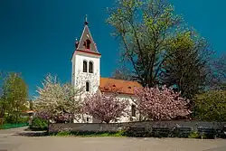 The origins of the church date back to the first half of the 12th century (around 1125). During the 14th century, the church was rebuilt in the Romanesque-Gothic style. At that time, it used to be a parish church. In the 19th century, the original Romanesque tower was destroyed by lightning, and subsequently replaced by a Neo-Romanesque tower between 1876 and 1880. The altar painting of the Blessed Virgin Mary was created in 1861. The church has three bells, the first two are dated 1876 and give a brief history of the church and the third is dated 1889.[2]