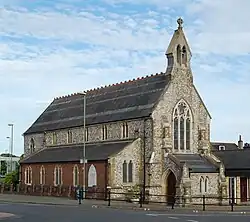 The red-brick presbytery (priest's house) was built in 1934 at the end of a nearby terrace of houses, and has a physical link to the church.[1] Postwar alterations to the road network in this part of the town centre have left the church "unfortunately marooned" between major roads.[9] A fire in 1973 prompted some internal changes, including the installation of new pews.[1]
