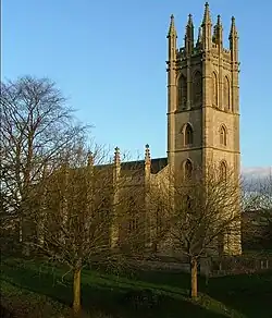The Church of England parish church of All Saints was designed by James Plowman of Oxford in 1826. It is an architectural mixture of imitations. The tower is a two-thirds copy of the tower of Magdalen College, Oxford, its hammerbeam roof a copy of the roof of Christ Church, Oxford, its buttresses are versions of those of the chapel of New College, Oxford,[8] and its windows are based on those from various Oxford Colleges. In a restoration appeal for the tower in 1975, Sir John Betjeman wrote of it: