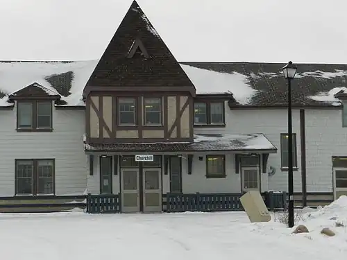 The railway to Churchill was originally built by the Canadian National and completed in 1929. The building contains elements of the Queen Anne Revival and the Arts and Crafts styles.[2] The Churchill railway station has been a national heritage railway station since 1992, and has been restored to its former design by the federal government.[3]