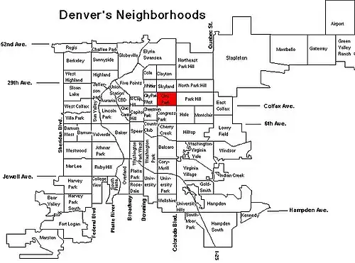 The City Park neighborhood highlighted on this map of Denver's neighborhoods