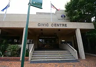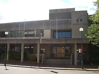 A new 'Civic Centre' concept with the provision of a performance hall, for a site on McMahon Street north of Dora Street was first proposed Mayor Olds on 17 July 1947, and was the subject of continuing debate throughout the 1950s.[22] The project was finally approved by Council in June 1954.[23][24] Designed in the Post-War International Style by architects Peddle Thorp & Walker and built by James S. Samson & Co. of Parramatta, the new Civic Centre included an auditorium which seated 1264 people (named Marana Hall in 1964, meaning 'place of stars') and a smaller hall (named Amaroo Hall in 1964, meaning 'lovely place'). Completed at a cost of £320,000, the Civic Centre was officially opened on 2 June 1962 by the Governor of New South Wales, Sir Eric Woodward.[25][26]