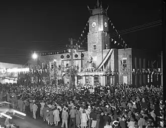 The name "Rockdale" for the West Botany area was first suggested in 1878, and that name gained more credence when the local railway station on the new Illawarra rail line, opened on 15 October 1884, was also given the name Rockdale.[18][19] However, by the time the neighbouring Boroughs of Botany and North Botany (Mascot from 1911) were proclaimed on 29 March 1888, it was clear that a name change was desirable. On 17 May 1888 the Parliament of New South Wales passed the Rockdale Municipality Naming Act (No.33, 1888), and West Botany became the "Municipal District of Rockdale".[20] On 31 December 1900, a fourth ward was added, Hopetoun Ward, named after the soon-to-be first Governor-General of Australia, bringing the number of aldermen to twelve.[21] The 1887 Town Hall was replaced by the current Rockdale Town Hall in 1940, and was designed by Rockdale architect Douglas Gardiner.[22]