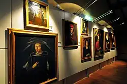 In 1668, during the period of greatest splendour of the Duchy of Mirandola, Duke Alessandro II Pico order to build the Galleria Nuova (New Gallery) in the centre of the castle of the Pico, frescoed by Biagio Falcieri and arranged to house the precious picture gallery composed of over 300 works of art by extraordinary artists such as Leonardo da Vinci, Raphael, Caravaggio, Titian, and many others, purchased in Verona in 1688.[3] Many of these masterpieces were lost with the devastating burst of the keep in 1714, while other works (including many portraits of the Pico family and paintings from the World Age and History of Psyche cycles by Sante Peranda) were taken away to the Ducal Palace of Mantua, where they are still found; other works are on display at the Galleria Estense in Modena.