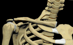 The collarbone is a thin doubly curved long bone that connects the arm to the trunk of the body.[4] Located directly above the first rib, it acts as a strut to keep the scapula in place so that the arm can hang freely. At its rounded medial end (sternal end), it articulates with the manubrium of the sternum (breastbone) at the sternoclavicular joint. At its flattened lateral end (acromial end), it articulates with the acromion, a process of the scapula (shoulder blade), at the acromioclavicular joint.