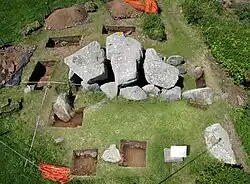 In 2017 the club undertook an excavation at the Neolithic monument of Le Trépied, situated on the western edge of Guernsey. Charcoal obtained from primary contexts were sent for radiocarbon dating which yielded a date range of 4447–4267 cal BC, the earliest yet for a passage grave in the Channel Islands and represents the likely construction date.
