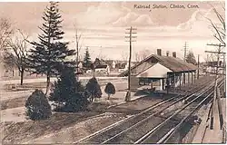 The New Haven & New London Railroad was charted in 1848, began construction in 1850, and opened for service in July 1852.[3] A combination depot (serving both freight and passengers) similar to others on the line was located on the south side of the tracks east of John Street in downtown Westbrook.[4][5] The line was owned by the New York, Providence and Boston Railroad (the "Stonington Road") from 1858 to 1862, and by the Shore Line Railway from 1864 until it was acquired by the New Haven Railroad in 1870.[3]