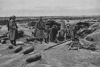 110th Siege Battery was formed at Sheerness under Army Council Instruction 397 of 21 February 1916 from a cadre of three officers and 93 other ranks supplied by the Clyde RGA (almost certainly 1/1st Company),[19][20] together with men drawn from the Thames and Medway Defences.[21] The personnel of the battery went out to the Western Front in May 1916 where they took over four old French 220mm 'Mortiers' – 1880 model heavy mortars employed as siege artillery. By the end of July the old mortars were worn out, and the battery spent August without guns, providing fatigue parties before it was armed with four modern 6-inch howitzers.[21][22]