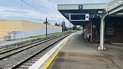 Eastbound view showing platforms, shelters and buildings, October 2022