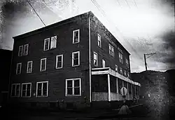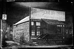 In 1921, a Union Bank branch opened.[61] In 1922, a new post office was erected.[62] During 1922–23, a new 40-metre (132 ft) howe truss bridge was installed over the river,[63] and a government liquor store opened.[64] A police constable was in residence 1922–1940.[65] The police post must have been initially at Upper town, because the jail building was later moved from there.[66] In 1924, a gym was built at the back of the Presbyterian church for use by school children.[67] Following church union in 1925, the Presbyterian church became a United church.[68] That year, the bank was rebranded on the merger of the Union Bank into the Royal Bank.[69] In 1927, Coalmont comprised a hotel, bank, jail, several stores, and Anglican and United churches. The school also used the church buildings.[70] The next year, the Blakeburn–Coalmont road was rebuilt.[71] In 1929, an electrical fire at the hotel caused limited damage.[72]