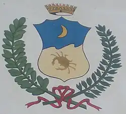 Shield bearing two intertwined branches of oak and olive tree and crest, surmounted by a crown, depicting at the top a half waning moon and a crab at the bottom.