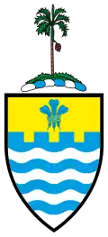 - Shield: Barry wavy of eight Azure and Argent a chief embattled Or overall a Pinang or areca-nut palm leaved and fructed Proper