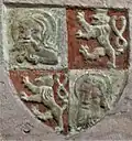 The first version of the coat of arms was created in 1292, and featured only the head of John the Baptist. After Wrocław became part of the Kingdom of Bohemia in 1335, the Bohemian lion was added to the shield in alternating quadrants. The only surviving example of this version of the shield now exists on the wall of Lauf Castle near Nuremberg.