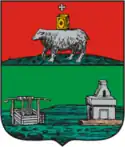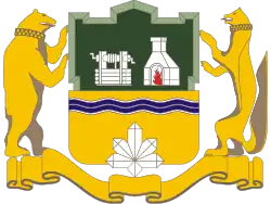 The coat of arms of Yekaterinburg (Russian: Герб Екатеринбурга) is the official municipal coat of arms of Yekaterinburg, Russia. The current symbol was adopted on 23 May 2008 and consists of a French shield divided horizontally into two fields, with a white mine shaft and a white furnace within the top field, which is green, and a blue wavy bend within the bottom field, which is gold. A gold bear and gold sable are located to the left and right of the shield, respectively. A gold crown with a gold laurel wreath is located above the shield and a gold ribbon is located below the shield. A grey druse is located at the bottom center of the shield.