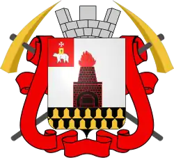 The official coat of arms was adopted by the city duma on 23 July 1998. The design was a horizontally-divided green and gold shield, with a silver mine shaft and a furnace with a red fire inside at the top field, and a blue wavy belt, bordered in silver. A gold bear and sable, with red tongues and collars of black and gold squirrel fur, stand to the left and right of the shield, respectively.[2]