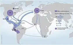 A map showing how cocaine travels from producers to consumers internationally.