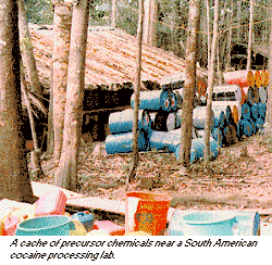 A cache of precursor chemicals near a South American cocaine processing lab