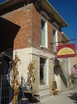 Most of the commercial buildings from the later decades of the 19th century are brick Italianate structures that feature flat roofs and parapetted fronts. Some of them have metal cornices, which were popular in many Iowa commercial districts of that era.[2] Houses from this period featured styles that were popular in the late Victorian era: Queen Anne, Eastiake, Shingle, as well as the Italianate. There are also a couple of small bungalows and plain, L-shaped front-gable houses. The tallest structure is the three-story Bard Hotel (207 N. Cody Road). The old Le Claire city hall at 201-203 N. Cody has a concave hipped roof, pedimented window hoods, and a decorative cornice. The former Presbyterian Church, located at 322 N. Cody Road, is the only historic church building in the district. It is a small frame structure that is four bays long with a central entrance tower on the front.