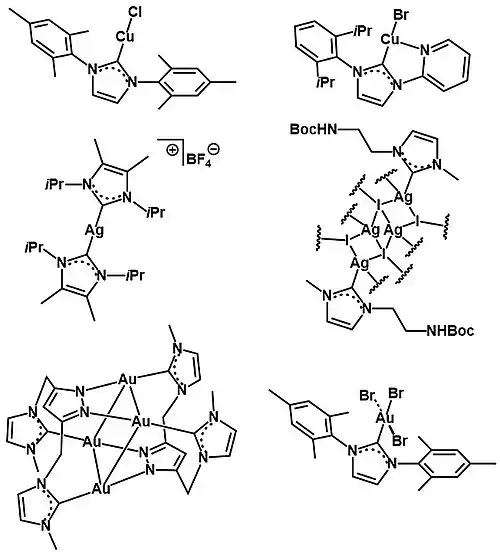 16. ^ a b Hu, Xile; Castro-Rodriguez, Ingrid; Olsen, Kristian; Meyer, Karsten (2004-02-01). "Group 11 Metal Complexes of N-Heterocyclic Carbene Ligands: Nature of the MetalCarbene Bond". Organometallics. 23 (4): 755–764. doi:10.1021/om0341855. ISSN 0276-7333.