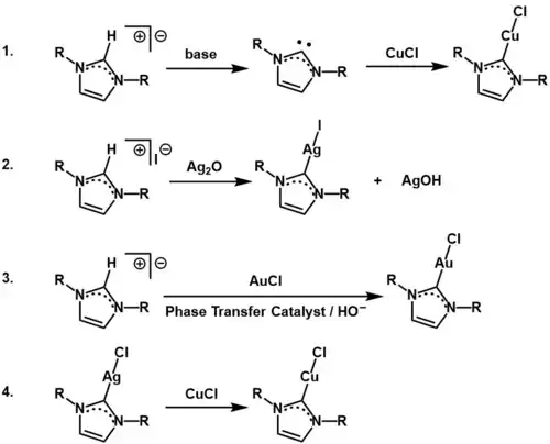 There are four typical methods to synthesize coinage metal NHC complexes:[2]