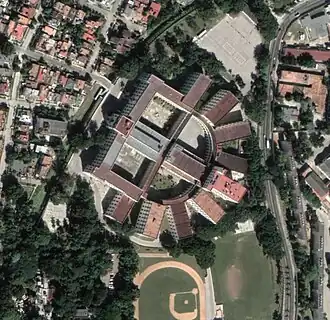 In mid-1923 the construction of this property was started, carried out by the company of architects and engineers Morales y Compañía Arquitectos, being built nine radiating pavilions, a central chapel of three floors, an entrance pavilion that had a fourth level where it was located the observatory. Its inaugural activities were carried out on December 19, 20 and 21, 1925, beginning its first course in January 1926.[4] The result was a monumental pan-optical edifice with an extensive neoclassical façade perpendicular to the large chapel and four large courtyards, recalling the building housing the convent in Havana Vieja, with three stories of porticoed galleries to link nine radial pavilions, the appearance is of instrumentality which is supported both in the design resources and the unusual dimensions of the spaces. The structure is built from the concrete-covered steel structure, the flooring, covered with tiles, and the roof are monolithic reinforced concrete slabs.