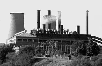 The power station was sold to the Electricity Supply Commission (Eskom) in January 1927.[6] It used coal that was brought in by rail from the coalfields of North Natal and water from the Tugela. It continued to be the provider of electrical power for the railways which by 1937 consisted of the whole of the Natal section of the Durban – Johannesburg line (516 route km) and the 229 km spur to Bethlehem in the Orange Free State. Between 1944 and 1959 a series of new generators were commissioned, resulting in the power station's capacity being increased to 160 MW.[6] However, in the 1960s, changes in technology led to a change in the economics of power production. New power stations such as Ingagane [7] were built at the coal fields themselves and the use 400 kVA power lines from 1972 onwards reduced the cost of transporting electricity. In the early 1980s Eskom initiated a major development programme: in 1980 new large power stations at Kriel (3,000 MW), Hendrina (2,000 MW) and Camden (1,600 MW) had been commissioned and in the next few years a number of other new power stations gave South Africa a surplus of generating capacity and many of the 1960s vintage power stations (including Colenso's refurbishment) had become uneconomic.[8] This meant that the continued use of the Colenso power station was no longer economically viable. The original part of the power station was decommissioned in 1970 and the 1944-1959 extensions in 1985.[6]