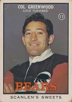 Colin "Col" Marius Greenwood (25 January 1936 – 3 October 1998) was a South African dual-code international rugby union and professional rugby league footballer who played in the 1960s, and coached rugby league in the 1960s. He played representative level rugby union (RU) for South Africa, at provincial level for Western Province, and at club level for Noordelikes (Northerns), as a centre,[1] and representative level rugby league (RL) for South Africa and Rugby League XIII, and at club level for Wakefield Trinity, North Sydney Bears and Canterbury-Bankstown Bulldogs, as a wing, stand-off, or lock,[2] and coached club level rugby league (RL) for North Sydney Bears.[3]