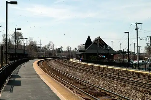 College Avenue is one of two stations on Metra's Union Pacific West Line located in Wheaton, Illinois. The station is located at 303 North President Street, and lies next to Wheaton College. The station is located 23.8 miles (38.3 km) away from Ogilvie Transportation Center, the eastern terminus of the West Line.[2] In Metra's zone-based fare system, College Avenue is in zone 4. As of 2018, College Avenue is the 47th busiest of the 236 non-downtown stations in the Metra system, with an average of 1,059 weekday boardings.[1] Unless otherwise announced, inbound trains use the north platform and outbound trains use the south platform.