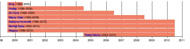 Niagara went undefeated in conference play in 1999–2000, winning the conference tournament and gaining an at-large invitation to the NCAA tournament. (The conference did not gain an automatic bid until the 2003 tournament.) Army spent only one season in the league before leaving for the MAAC. Findlay dropped its hockey programs following the 2003–2004 season, to be replaced by Robert Morris, which began play in 2004–2005. After Air Force left for Atlantic Hockey in 2006 and Wayne State dropped its program in 2008, the conference was left with only four teams. The CHA sought to add new programs to its men's league, hoping to draw interest from some of the top club teams in the country, including Kennesaw State University.[3] However, these efforts came up short, with CHA and school personnel citing Title IX as a major hurdle in the negotiations.[19]