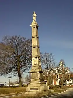 Between the cathedral and the high school sits the Civil War Soldier's monument in the middle of Main Street. The monument is a stone obelisk topped by a statue of a soldier, which faces south towards the Mississippi River in the valley below. Battles in which local soldiers fought are engraved on each side of the obelisk in two rows. The battles listed are: Shilo, Donelson, Wilsons Creek, Fort Blakeley, Corinth, Prairie Grove, and Vicksburg. It was built in 1880, and listed on the Davenport Register of Historic Properties in 1993.[15][16]