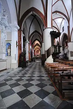 The central pilaster have fragments of frescoes from 1520 and earlier depicting the Madonna. The ciborium dates from the late 11th-century. The organ (1733) built by Giovanni Domenico Traeri was frescoed in the 15th century. The church also has paintings by Giovanni Battista Natali and Antonio Alessandri.[3][4]