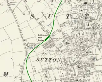 The station was to have been built on the W&SR's planned surface railway line in Surrey (now south-west London) from Wimbledon to Sutton.[1] The station was to be near the junction of Collingwood Road and Sydney Road.[2] The construction of the railway was approved in 1910.[3] In 1911 the UERL agreed to provide funding for the line's construction and to operate its train services by extending the UERL's District Railway (DR) from Wimbledon station.[2]