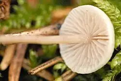 The caps of young mushrooms are roughly spherical, but soon become convex to flattened in maturity, and reach diameters of 2–9 mm (0.08–0.35 in).[9] The cap margin is rolled or curled inward when young, but straightens out as it matures.[10] The cap color is white to cream. The gills are broadly adnate to slightly decurrent, with a color similar to the cap; their spacing is close to subdistant.[11] The whitish stem is equal in width throughout, usually not straight but with curves, and 2–5 cm (0.8–2.0 in) long by 0.3–1.0 mm (0.01–0.04 in) thick.[9] The upper region of the stem surface can be covered with what appears to be a white powder, and there are thin hairs near the base.[10] The stems originate from a yellowish-brown sclerotium that is up to 6 mm (0.24 in) long.[9] The sclerotium ranges in shape from roughly spherical to almond-shaped to irregular, and its surface is often wrinkled and pitted.[12] The mushroom has no distinctive odor or taste, and its edibility is unknown.[10]