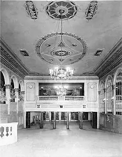 The interior had a three-story auditorium with two balconies. The marble used was rose Tavernell imported from France. The three grand chandeliers lit the long center ramp that swept up to the interior doors. Set in the marble arches of the columns were baskets of flowers, gifts from Wilmer's and Vincent's many clients in the theater world.[1]
