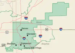 Following the 2010 United States census and consequential redistricting of Colorado's congressional districts, the 1st congressional district consisted of all of the City and County of Denver and parts of Arapahoe County including parts or all of the cities of Englewood , Cherry Hills Village , Sheridan , Aurora , and Glendale . The 1st district also took in additional area in the southwestern suburbs which included parts of Jefferson County and the CDPs of Columbine and Ken Caryl .