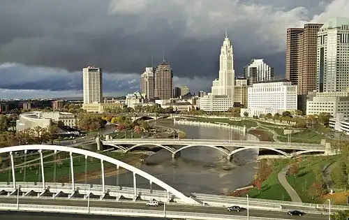 The Columbus Civic Center Historic District is a historic district comprising most of the civic center. It includes Central High School (NRHP-listed, 1924), Columbus City Hall (built 1928), the former Central Police Station (1930), the Ohio Judicial Center (NRHP-listed, 1933), and the Joseph P. Kinneary United States Courthouse (NRHP-listed, 1934).[3] It also includes the riverfront retaining wall, spanning from Broad to Town Streets. The c. 1921 Scioto River Bridge Group (comprising the Broad Street, Town Street, and Main Street Bridges) was listed, though the bridges were replaced in recent decades by the Discovery Bridge, the Rich Street Bridge, and a new Main Street Bridge. The Front Street office buildings were included as non-contributing buildings.[4]