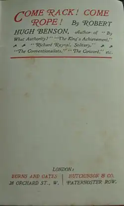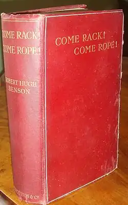 Come Rack! Come Rope! is a historical novel published in 1912 by the English priest and writer Robert Hugh Benson (1871–1914), a convert to Catholicism from Anglicanism. Set in Derbyshire at the time of the Elizabethan persecution of Catholics, when being or harbouring a priest was considered treason and was punishable with death, it tells the story of two young lovers who give up their chance of happiness together, choosing instead to face imprisonment and martyrdom, so that God's will may be done.