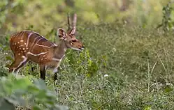 Comoé National Park has the most biodiverse savannah in the world and forms the northern limit for many animal species, like the yellow-backed duiker and bongo.[3] There are a total of 135 mammal species in the park.[2] This includes 11 species of primates like the olive baboon, green monkey, lesser spot-nosed monkey, Mona monkey, black and white colobus, olive colobus, white-collared mangabey and chimpanzee. A total of 17 carnivore species registered, but at least 3 species are believed to have become extinct in the park - cheetah, wild dog (since 1993) and most recently lion (no signs of lions have been found since 2008). There are also 21 species of artiodactyl present in the park including hippopotamus, bushpig, bongo, warthog, buffalo, kob, red-flanked duiker, bushbuck, waterbuck, roan antelope and oribi.[11] Threatened mammal species include the chimpanzee (EN), white-collared mangabey (EN), ursine colobus (VU), African elephant (VU), hippopotamus (VU), giant pangolin (VU), long-tailed pangolin (VU), leopard (VU), African golden cat (VU), Buffon kob (VU), bongo (NT), western hartebeest (NT), Defassa waterbuck (NT), bay duiker (NT), yellow-backed duiker (NT), olive colobus (NT).