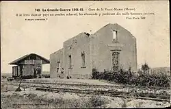 Station building with a military horse-drawn ambulance of the 6e Corps and a guard house, 1916. Preserved unter the ownership and management of Le Conseil Départemental de la Meuse. |