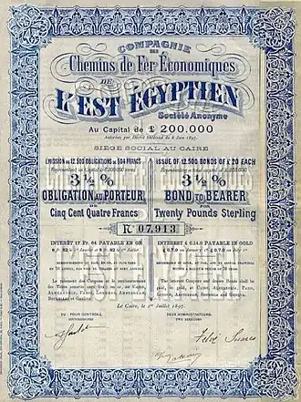 The railway company issued 12,500 stock exchange certificates at 3.5% of the total capital, i.e. 20 GBP (504 F) each, to be paid back within 70 years. The Paribas bank purchased shares at the value of 446.25 F and re-sold them at the same price to the public withholding a 4% premium. From a political point of view, this was one of the best concessions of Lower-Egypt and increased the French influence onto the region. The guaranteed annual net income of 315,000 F for the 350 km of railway track, promised to provide a profitable margin in comparison to the 242,304 F investment.[1] § 52 The results exceeded the most optimistic prognoses of the founders, which led to an increase of capital to 8,125,000 F in March 1900. The new 100 F shares were issued at 106,25 F, to gain 3,320,300 F. A quarter of the first and second tranche of the shares and all loans were sold in France at a total of 7,674,141 F.[1] § 53