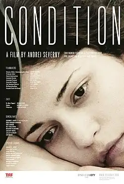 Condition is a 2011 science fiction film, directed by Andrei Severny and produced by Amir Naderi. The film is a meditative psychological drama set in apocalyptic atmosphere. The story is a sensory battle of the two female characters: sound therapist Mary Taggert and her patient, a disturbed young woman named Alaska.[1] The doctor evacuates with her patient, driving a car away from the city to unspecified northern territory towards the border. Having run out of gas, two women are stranded in mysterious rough and rocky wilderness close to the ocean where it becomes a battle for survival and a struggle with the inner wounds and salvation with sound and nature.[2] The psychologically complex and slow narrative of Condition relies on sequences of abstract images that one could expect to see at a museum or gallery.[3]