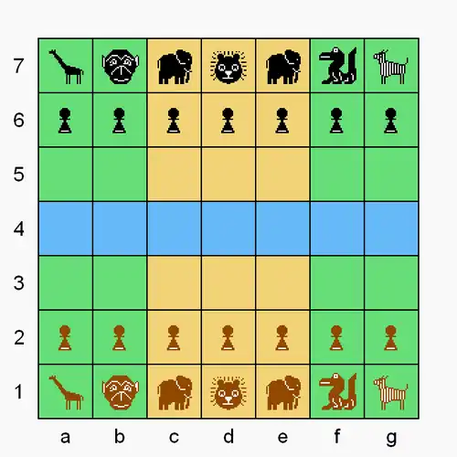 Congo gameboard and starting setup. In the diagram, castles are tan color; the river is blue. Initial setup: giraffes (a-file), monkeys (b-file), elephants (c- and e-files), lions (d-file), crocodiles (f-file), and zebras (g-file). Pawns fill each player's second rank.