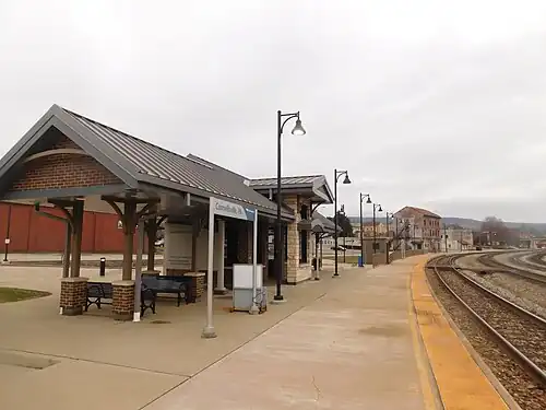 The current station is the third station placed here. It was constructed during the winter of 2010-11 and cost $1.25 million.[2] Built primarily of dark red brick, the structure has an enclosed, one-story waiting room with large windows. From the outside, the waiting room is marked by projecting bays whose surfaces are covered in a rock-faced, coursed ashlar in a light beige tone. Developed by d+A design+Architecture of Yardley, Pennsylvania, the station design draws inspiration from historic late 19th and early 20th century depots found in small towns across the nation. It is similar to stations Amtrak has built in Okeechobee, Florida, Winnemucca, Nevada and Alliance, Ohio. In addition to the shelter, Amtrak installed a 550-foot (170 m) concrete side platform, signage and light poles. The new station is in the vicinity of the former Baltimore & Ohio Railroad station, which no longer stands.[3]