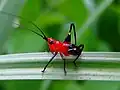 This medium-sized conehead has hind femora with knees darkened: which is diagnostic.[3] The crimson-orange nymphs are quite noticeable in the grasses and shrubs where they develop.