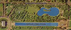 USGS satellite image of Constitution Gardens, located north of the reflecting pool, northeast of the Lincoln Memorial (#1 on the image), east of the Vietnam Veterans Memorial (#2 on the image), and northwest of the National World War II Memorial (#3 on the image).