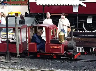 There is also a one-third full-size (1:3) electric tramcar which runs for a 0.5-mile (805 m) on the site, on track of 15 in (381 mm) gauge. This is one of only two electric tramways in Wales (the other being a short 18 in (457 mm) gauge electric tramway in Heath Park, Cardiff, owned by Cardiff Model Engineering Society).[1][2]