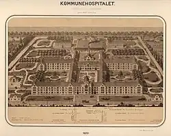 The hospital was operated by Copenhagen Municipality. Very modern for its time, it contained 844 beds and pioneered a number of treatments, techniques and diagnoses in Denmark.[1] The hospital became a university hospital in 1873 and introduced the first professional training of nurses in Denmark in 1876.