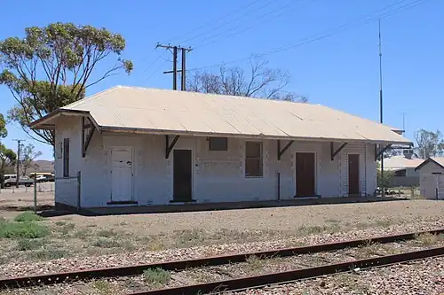 The narrow-gauge railway south of Leigh Creek was under pressure from coal trains, with the coal trains getting heavier as time went on. A solution was needed to help increase capacity for the coal trains, with multiple options being identified for a standard gauge railway. These included upgrading the existing line to Leigh Creek or making a new railway that ran to the west of the Flinders Ranges, bypassing the Pichi Richi Pass. It was eventually chosen to build the new railway, and it opened to Leigh Creek in 1956 and Marree in 1957, with Copley being one of the places where the 2 lines crossed over.[3] From then on, the original narrow-gauge alignment was progressively abandoned, with the Port Augusta to Hawker alignment finally being closed in 1972.[4] As part of the new standard-gauge railway, the station was rebuilt with a brick station building similar to those at Telford and Marree, and a goods platform.
